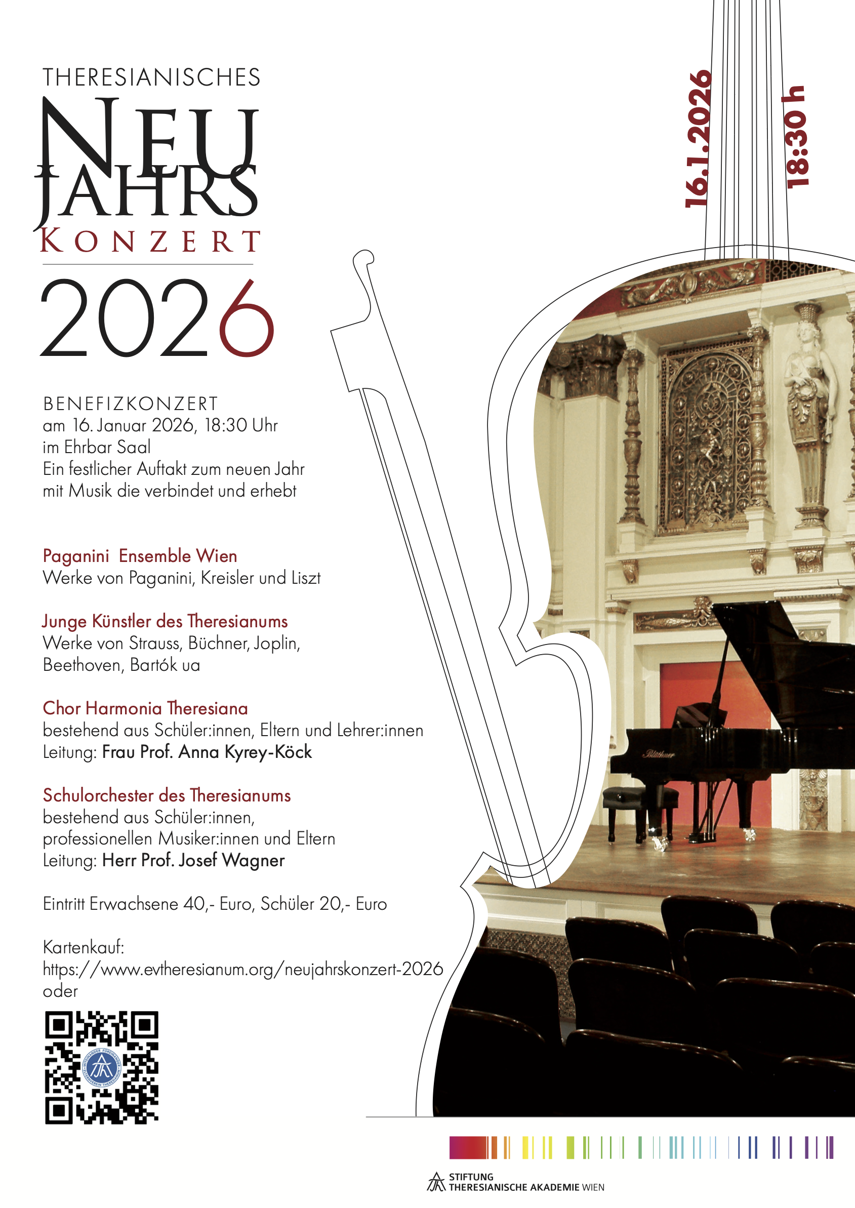 Wir laden Sie herzlich am 16. Jänner 2026 in den Ehrbarsaal zum Neujahrskonzert der Theresianischen Akademie 2026 ein.